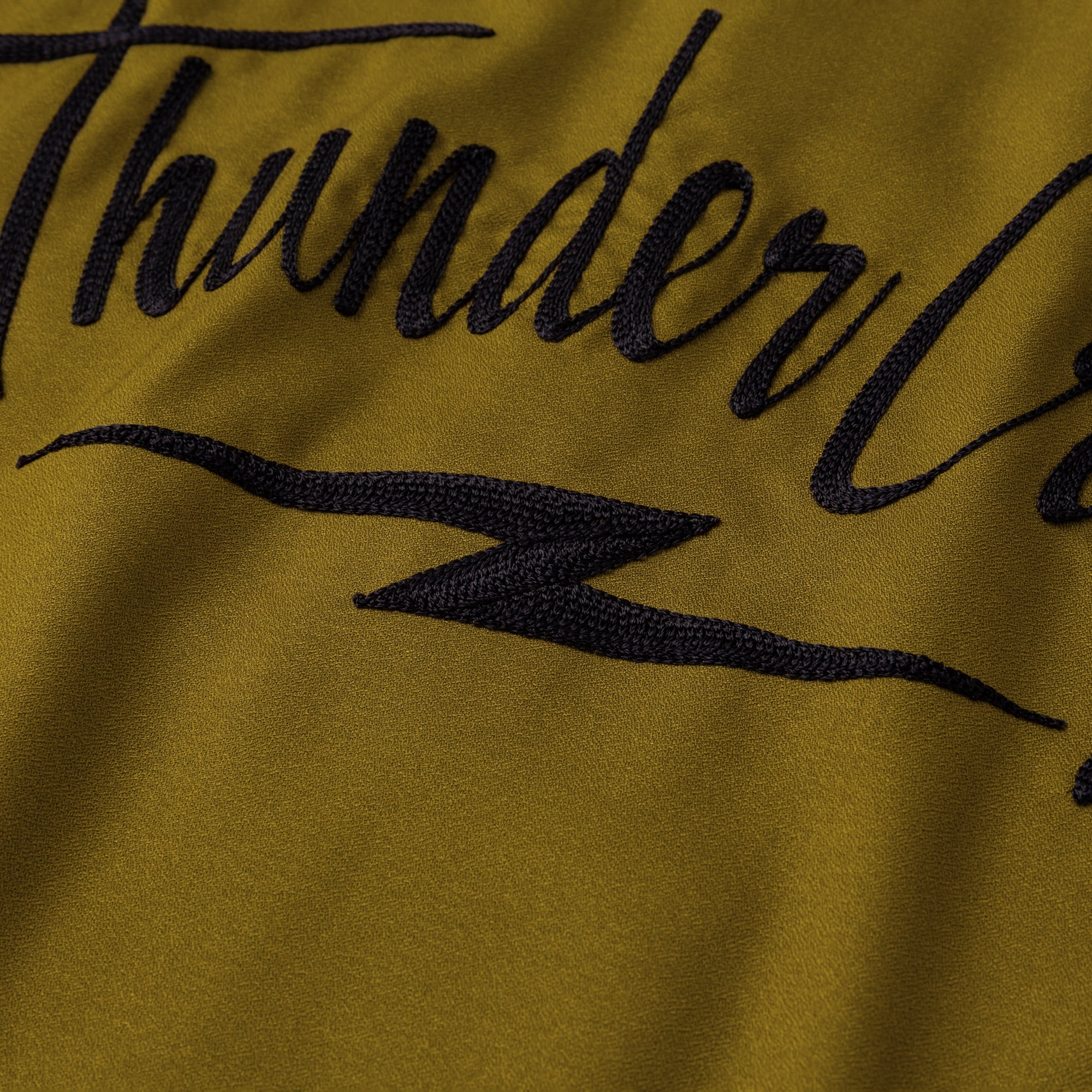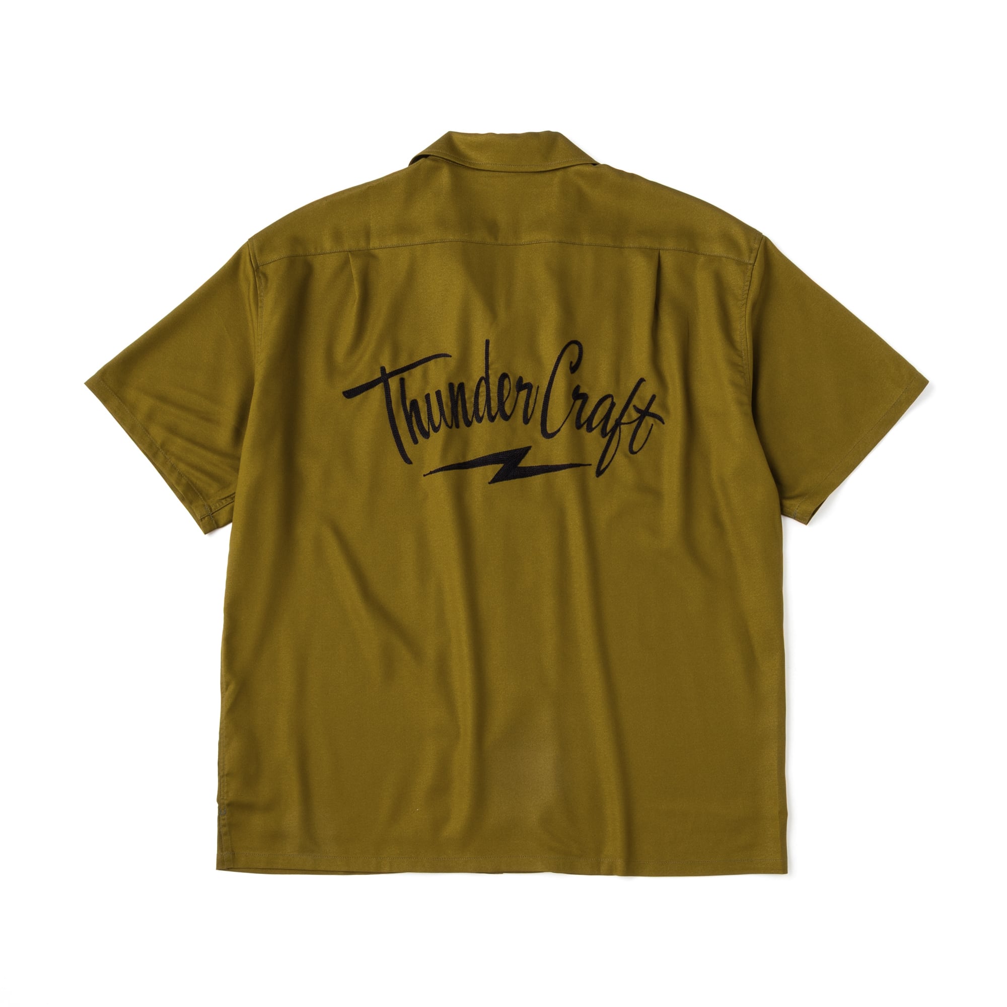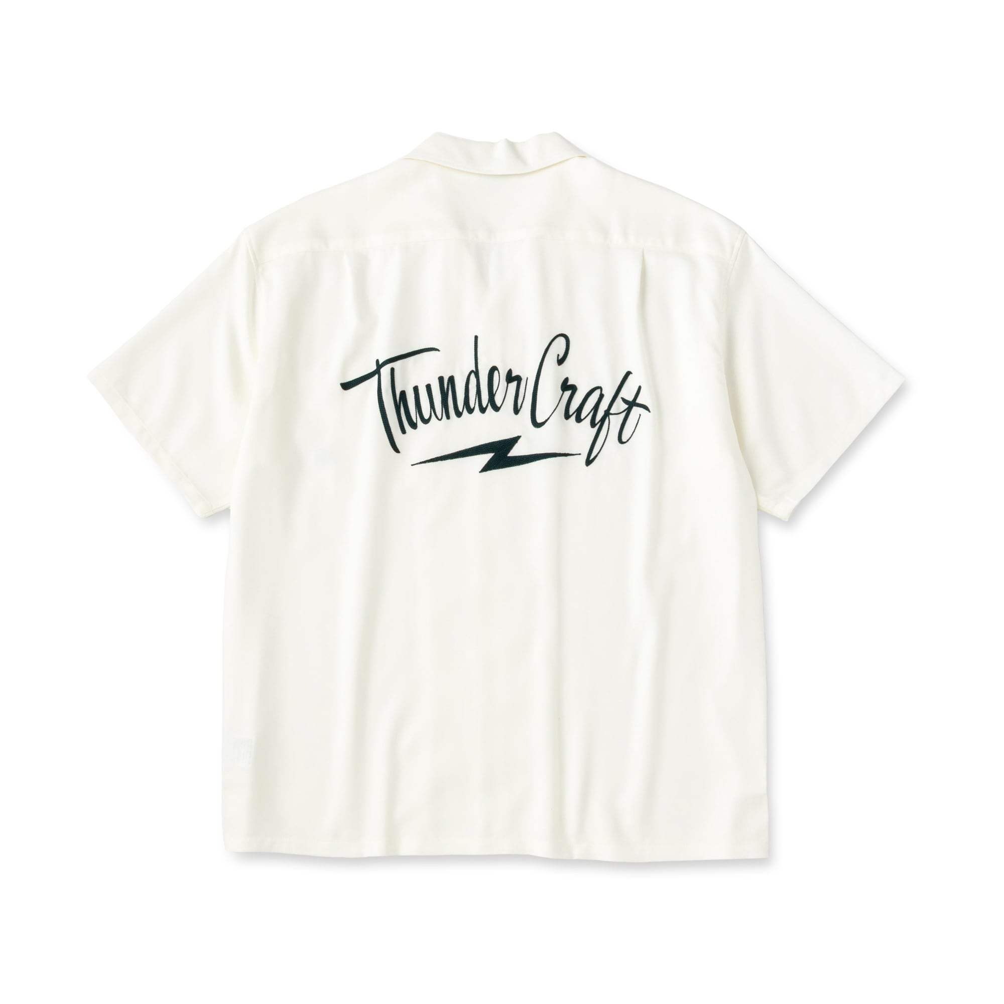 オープンカラー刺繍S/Sシャツ。ポリエステルの芯にレーヨンを巻き付けたコアヤーン糸を作り、アムンゼン組織にて製織した生地を採用。表面はレーヨンでもポリ芯に撚ることでシワになりにくいのが特徴。背面にチェーンステッチで『THUNDER CRAFT』の刺繍が入る。