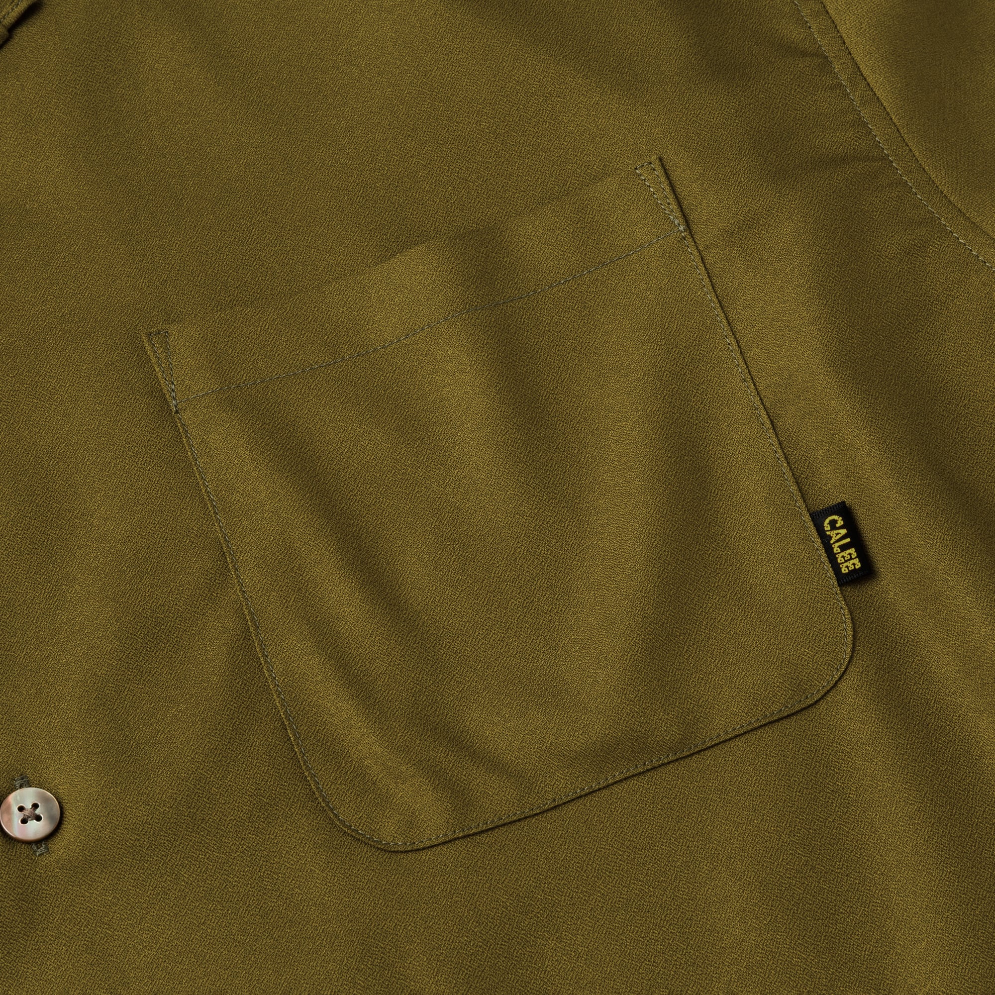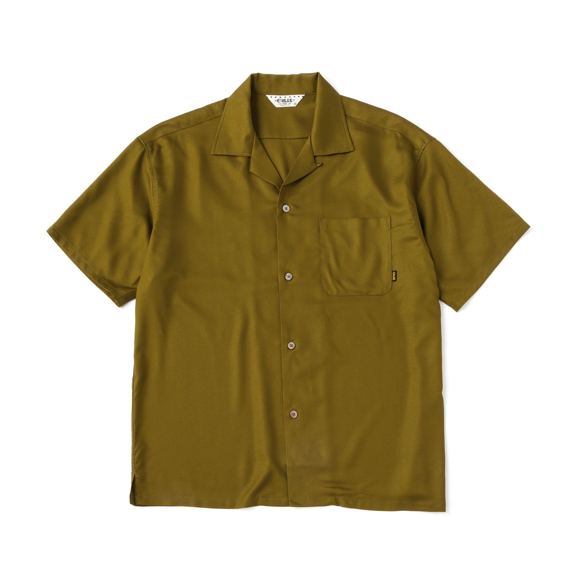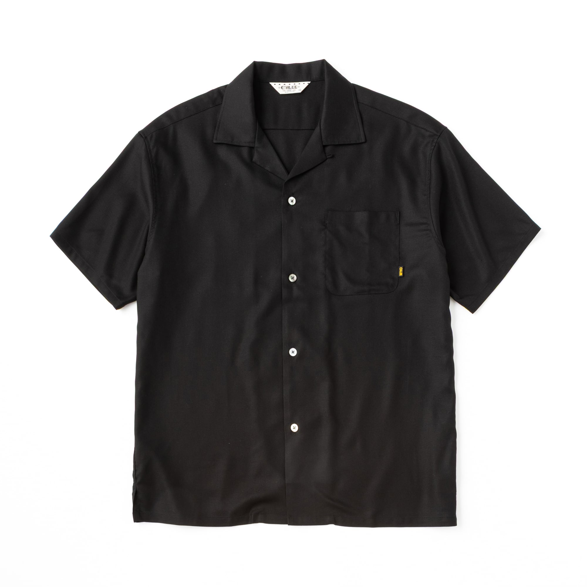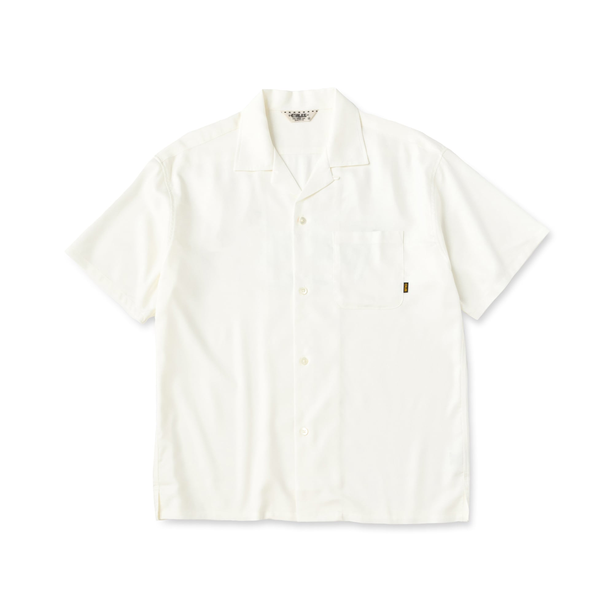 オープンカラー刺繍S/Sシャツ。ポリエステルの芯にレーヨンを巻き付けたコアヤーン糸を作り、アムンゼン組織にて製織した生地を採用。表面はレーヨンでもポリ芯に撚ることでシワになりにくいのが特徴。背面にチェーンステッチで『THUNDER CRAFT』の刺繍が入る。