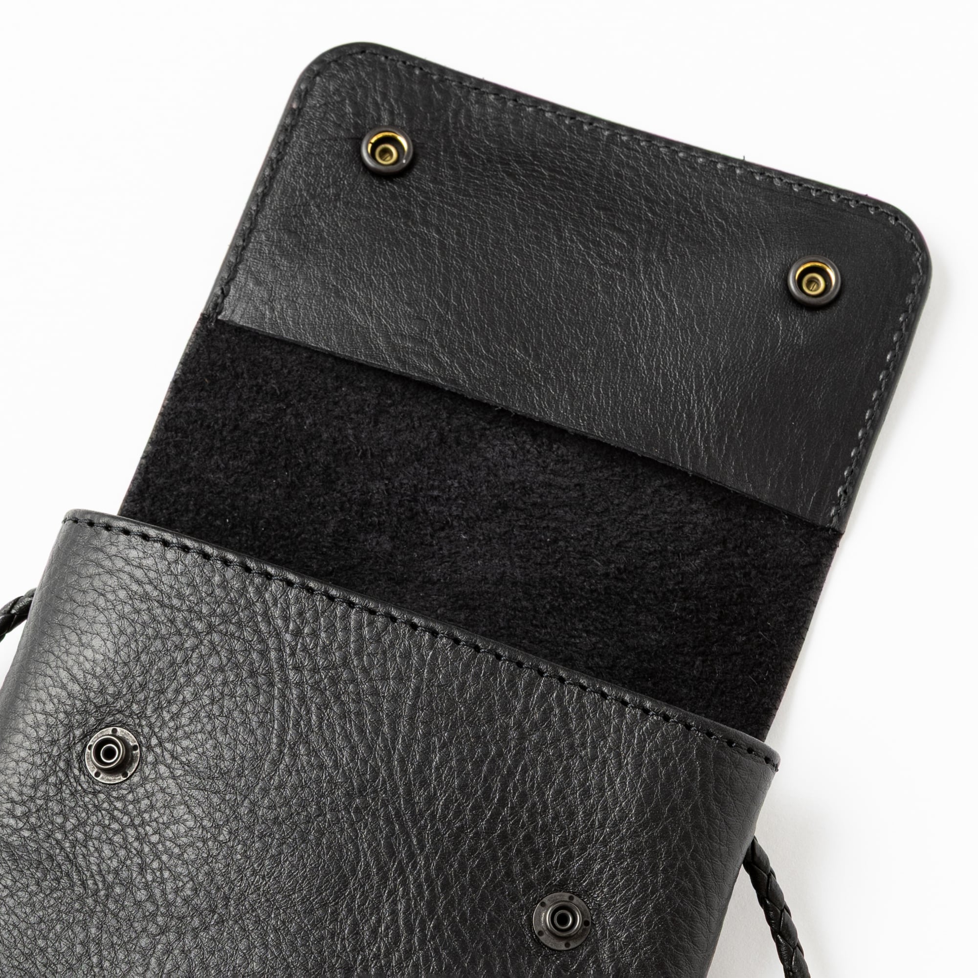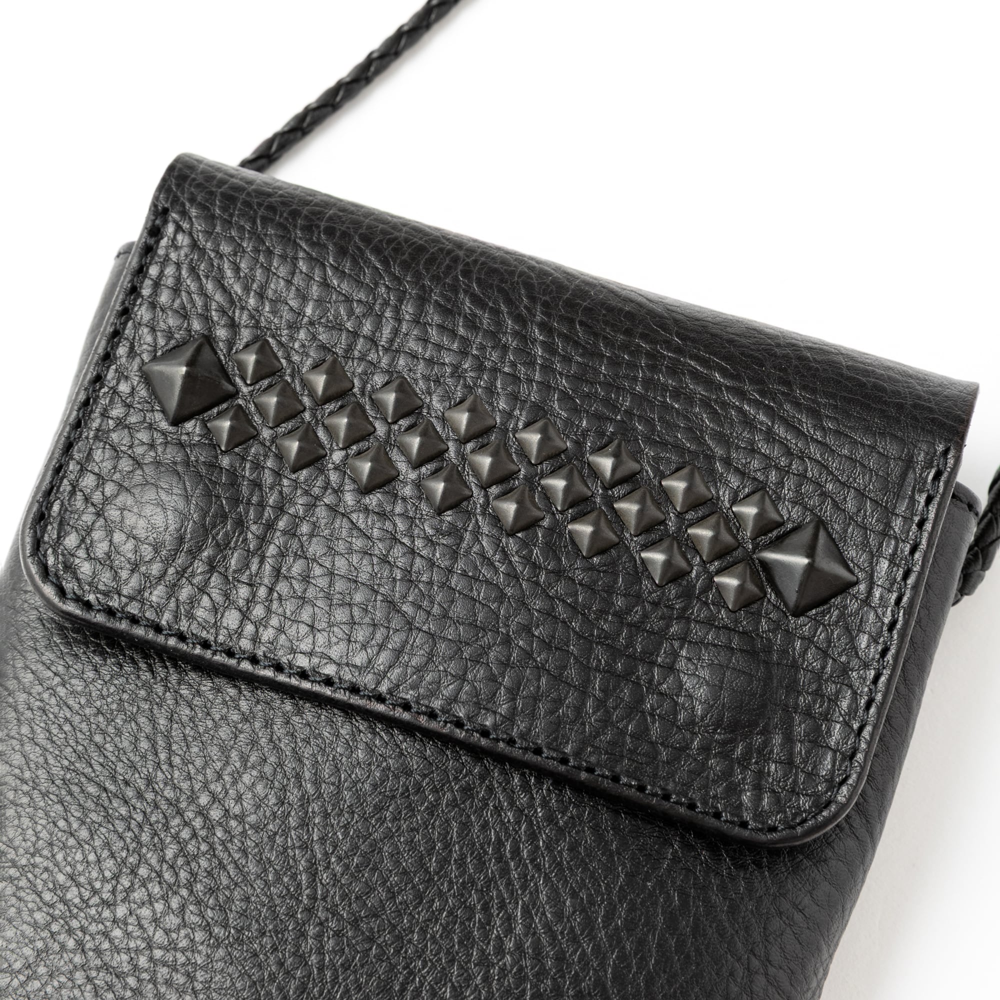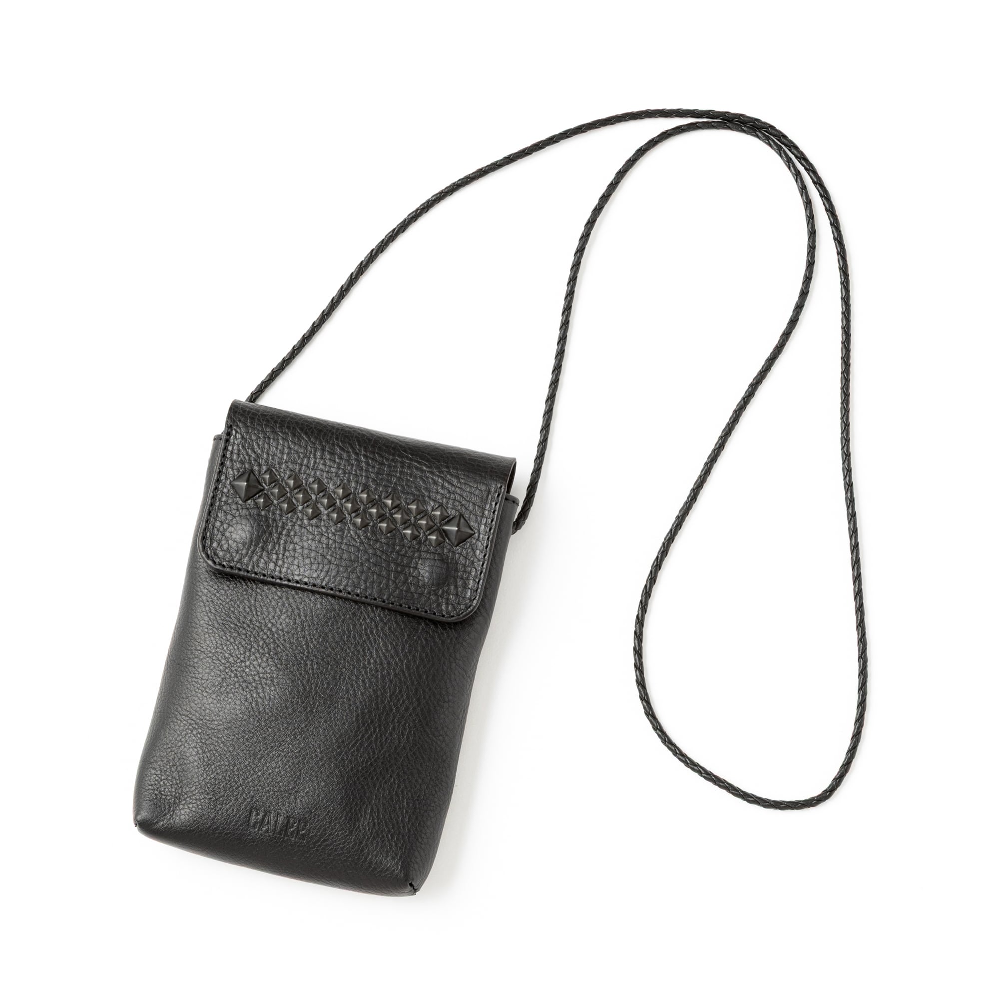 シボ感あるレザーで作製されたブラックスタッズショルダーポーチ。シボが特徴のレザーで使い込む程に、シボ感が消え、光沢感が出てくる経年変化。スタッズに黒メッキ加工を施した。