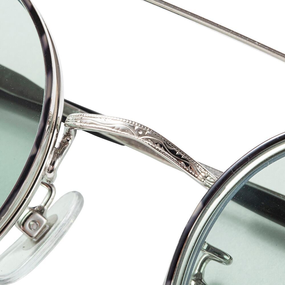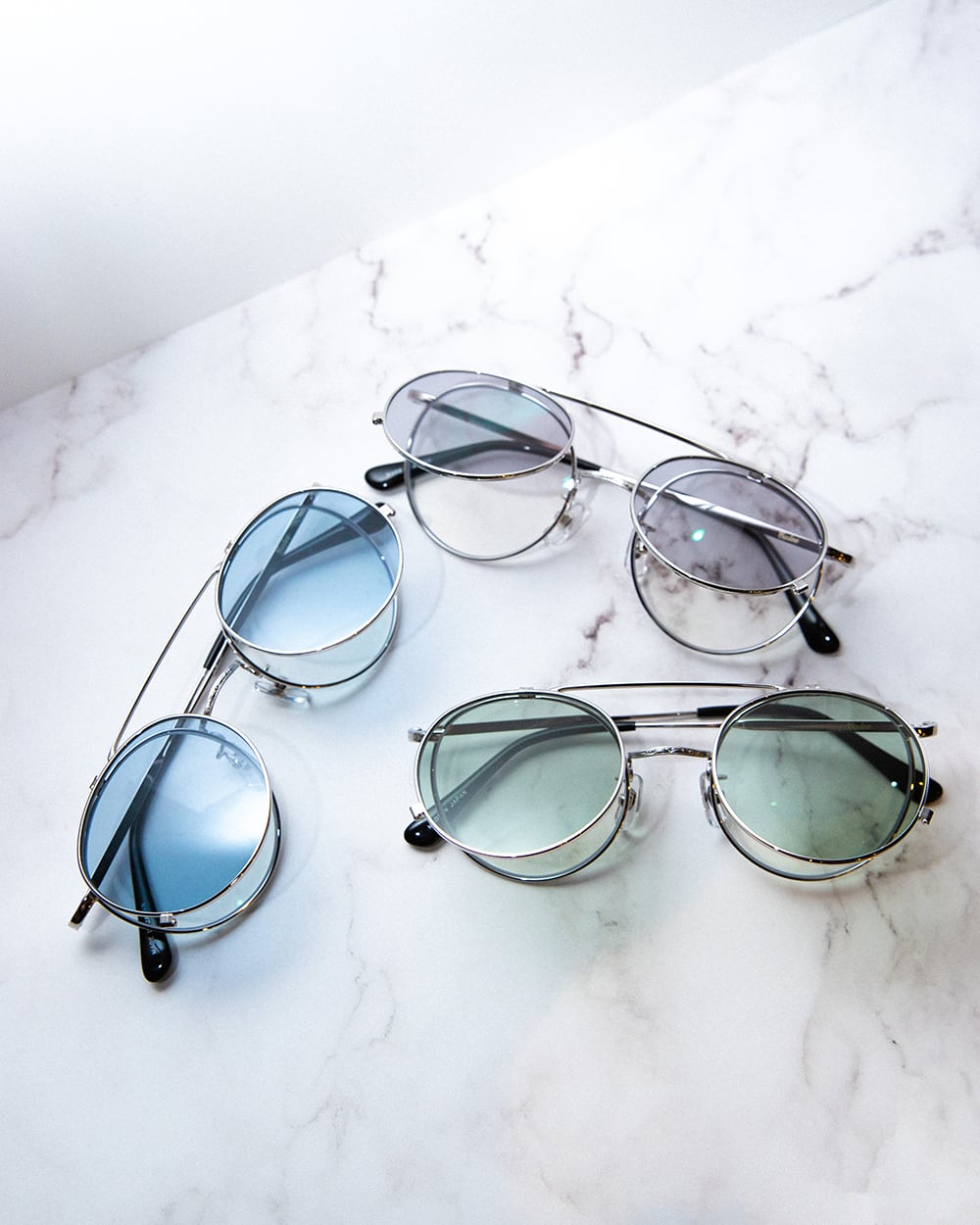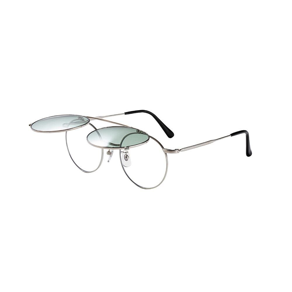メガネの一大産地である福井県鯖江で職人によるハンドメイドで作製されたサークルタイプのフリップアップグラシーズ。レンズが2枚重なった複式跳ね上げタイプ。メタルフレームを採用。 45□22-145 no : CL-26SS001G EX size : FREE color : GRAY / BLUE / GREEN fabric : METAL