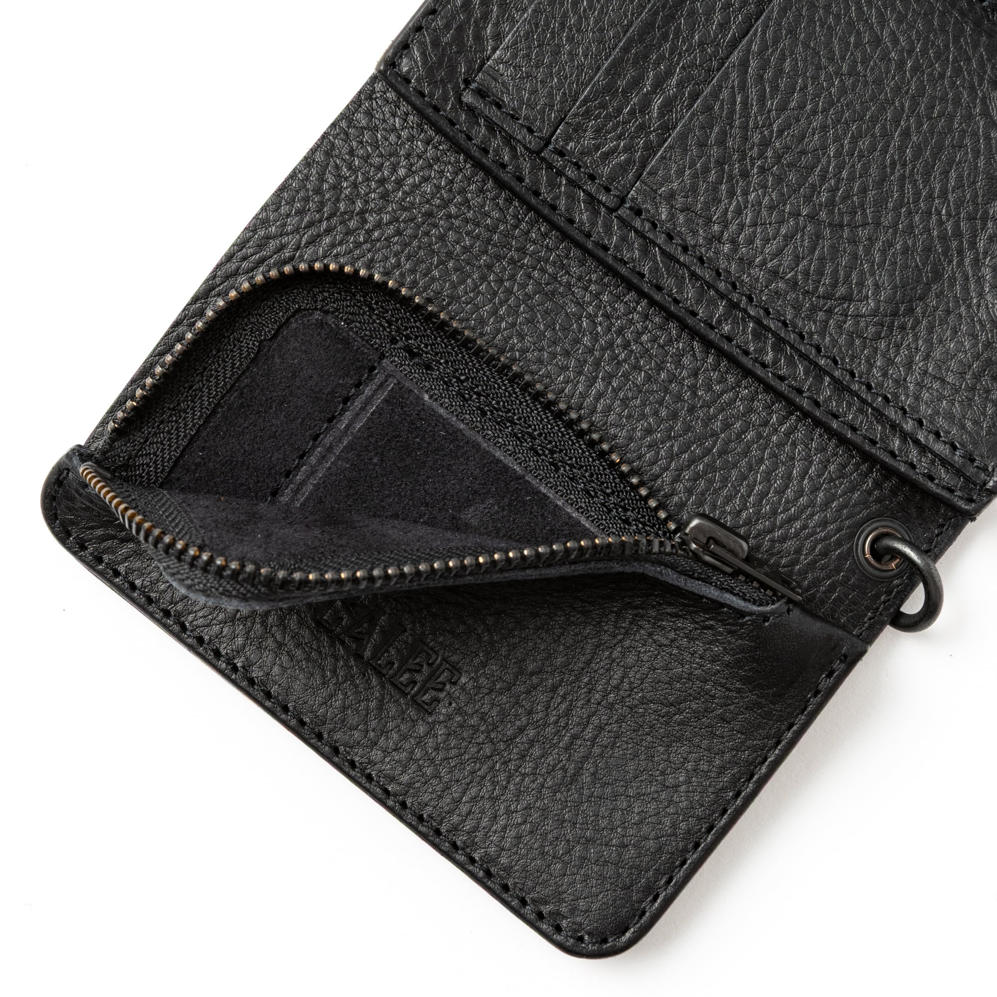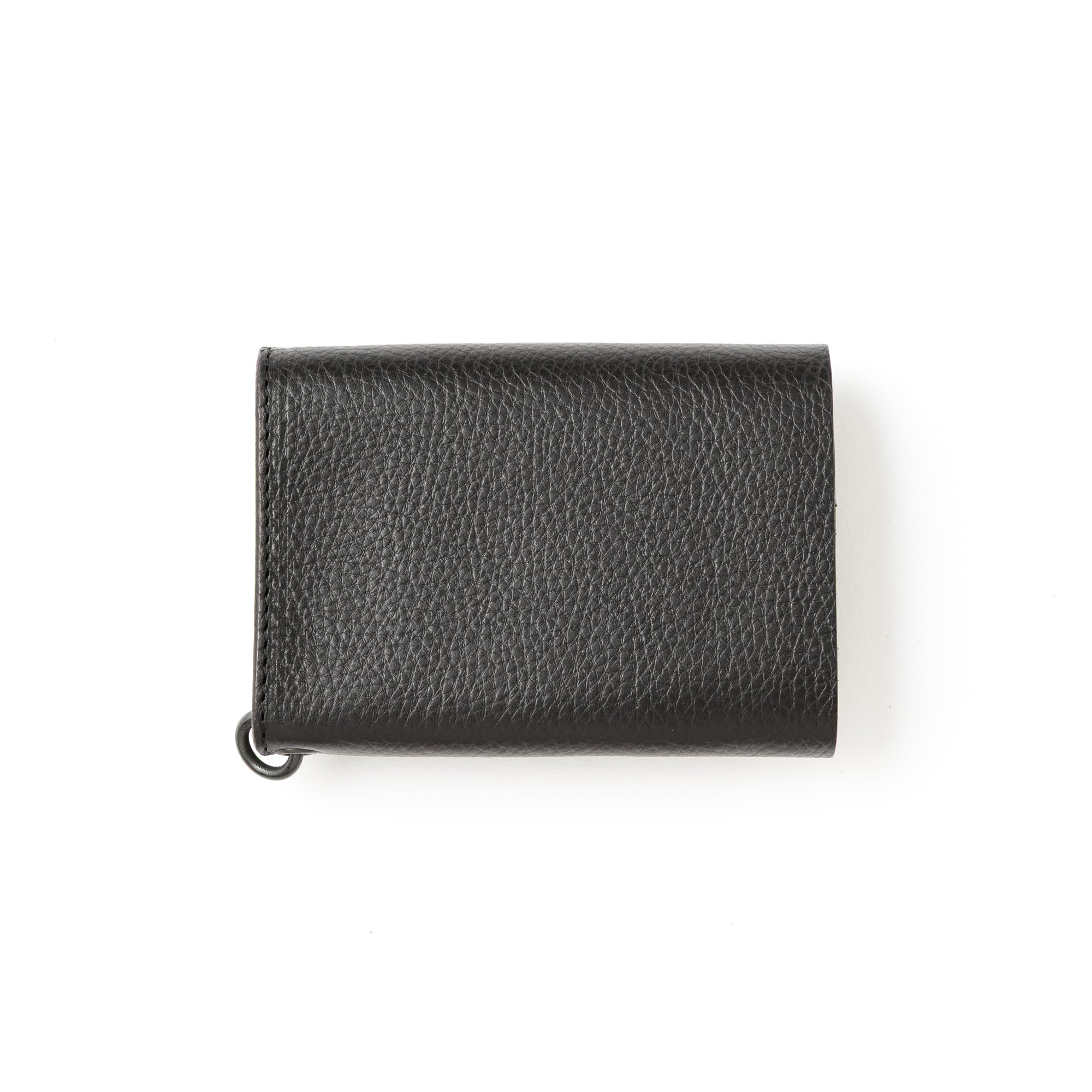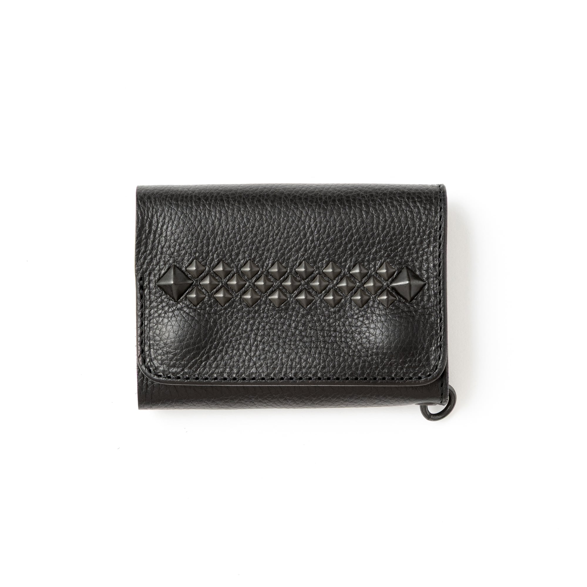 シボ感あるレザーにブラックスタッズを使用して作製された三つ折りタイプのハーフウォレット。レザーは使い込む程にシボが消え、艶感ある経年変化を楽しむ事が出来る。また、収納もしっかりと確保し、使い勝手の良いウォレットに仕上がっている。スタッズに黒メッキ加工を施した。