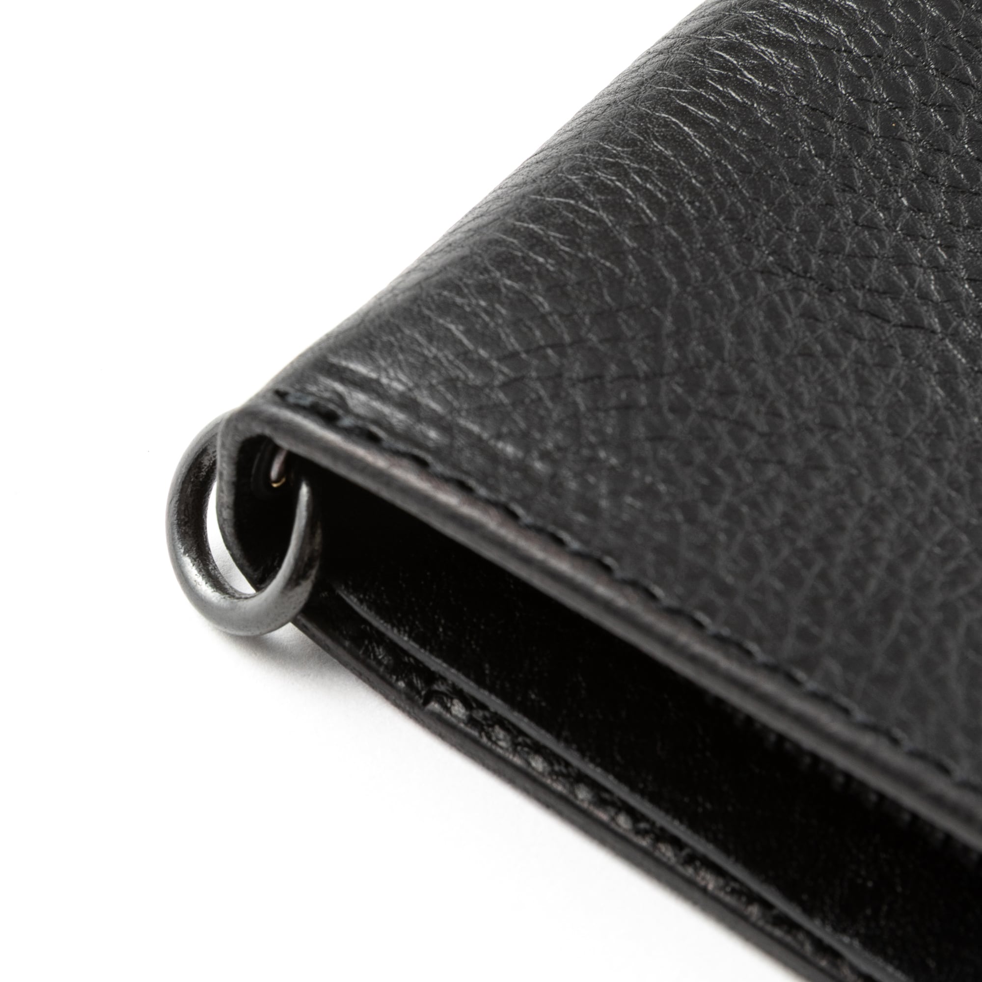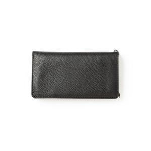シボ感あるレザーにブラックスタッズを使用して作製されたロングウォレット。レザーは使い込む程にシボが消え、艶感ある経年変化を楽しむ事が出来る。また、収納もしっかりと確保し、使い勝手の良いウォレットに仕上がっている。スタッズに黒メッキ加工を施した。